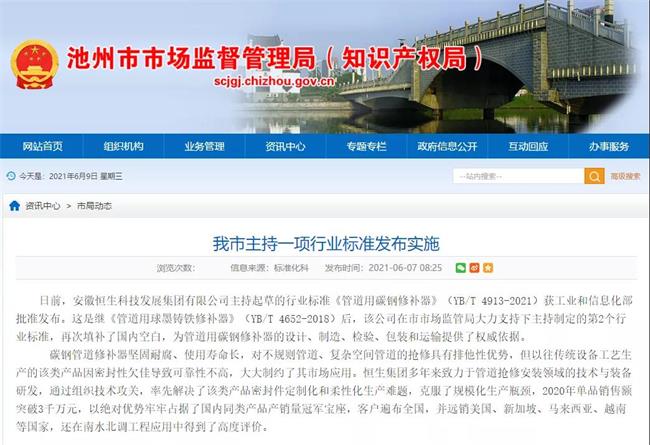恒生集團始終堅持用標準和創(chuàng)新持續(xù)引領行業(yè)發(fā)展,日前,由恒生集團主持起草的行業(yè)標準《管道用碳鋼修補器》(YB/T 4913-2021)獲工業(yè)和信息化部批準發(fā)布。這是繼《管道用球墨鑄鐵修補器》(YB/T 4652-2018)后,恒生集團主持制定的第2個行業(yè)標準,再次填補了國內空白,為管道用碳鋼修補器的設計、制造、檢驗、包裝和運輸提供了權威依據。