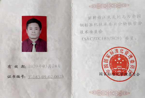 汪良美董事長(zhǎng)被聘為全國(guó)鋼標(biāo)委鑄鐵管分技術(shù)委員會(huì)委員